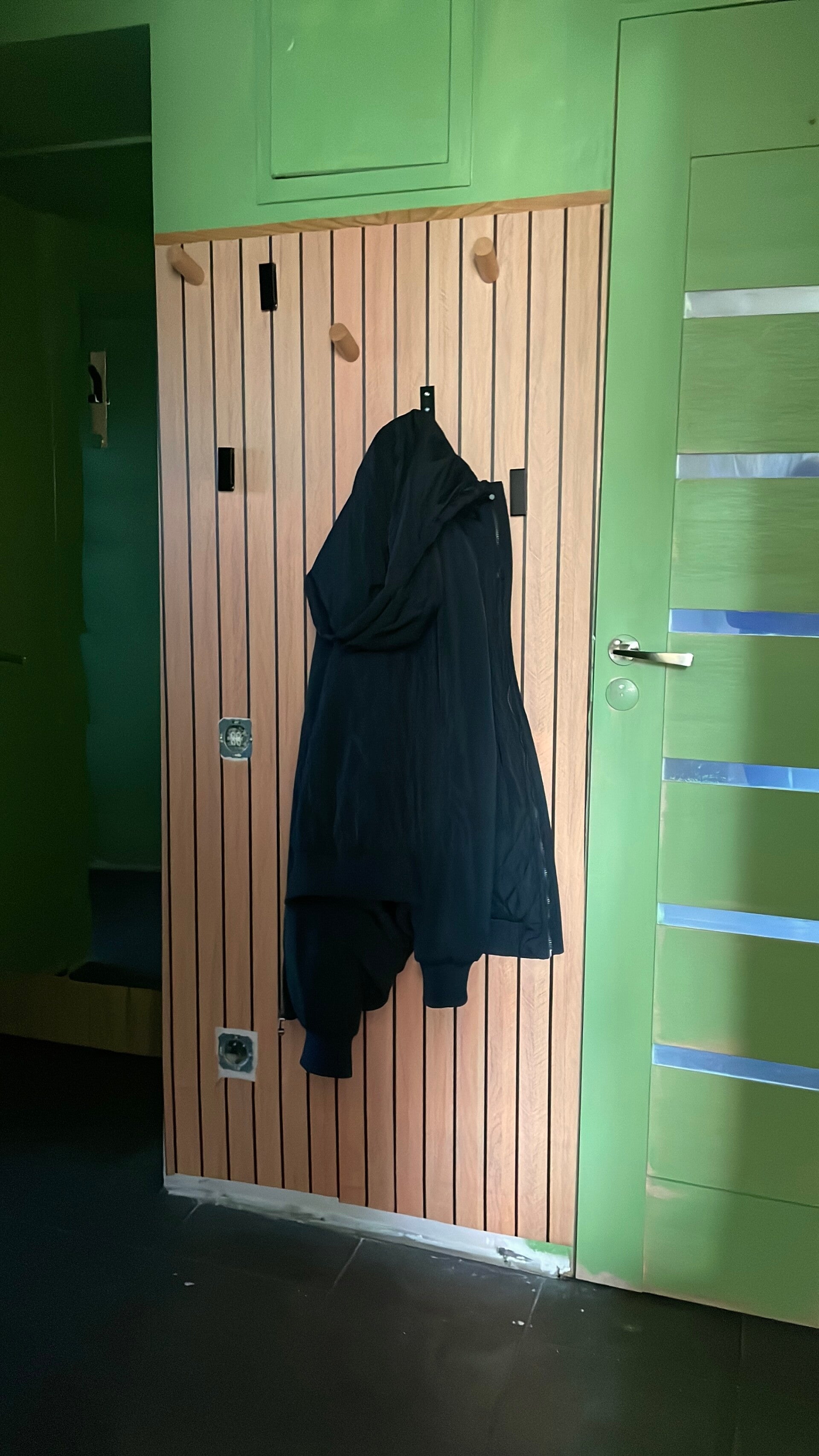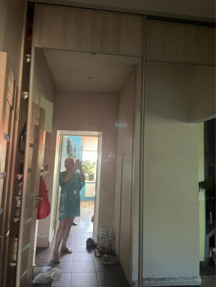 The hallway was dark even with light-colored walls (the walls were almost white, but they looked gray under artificial light). There were no windows, a huge built-in closet that was rarely used for its intended purpose, and a storage room filled with fireplace paper. The area was 5m2.