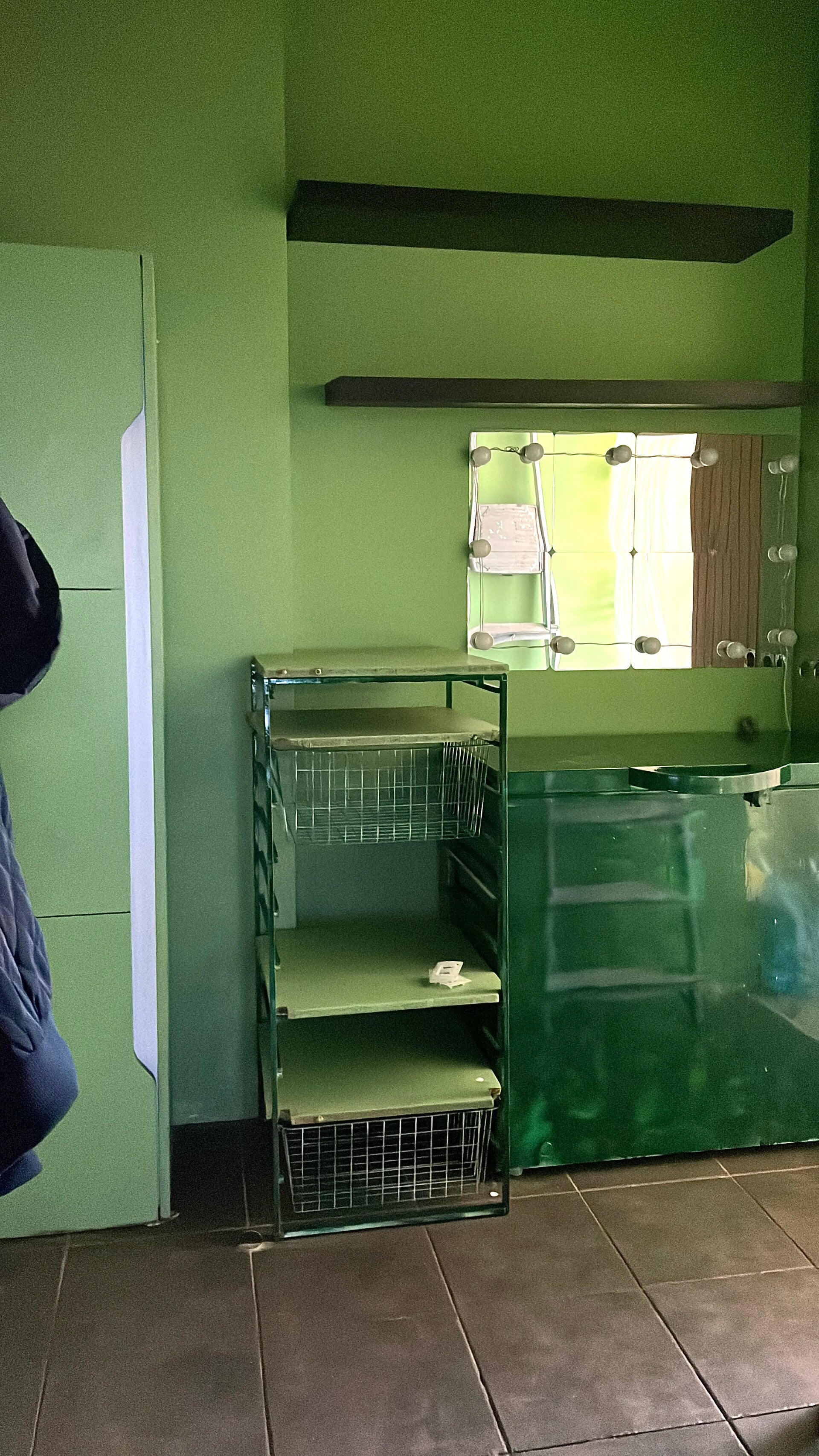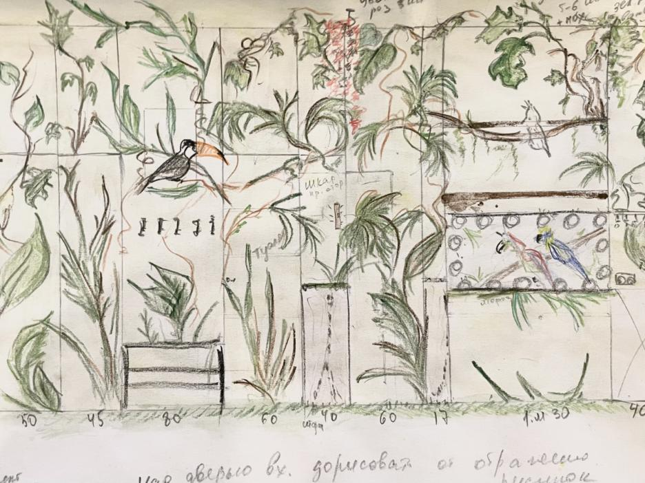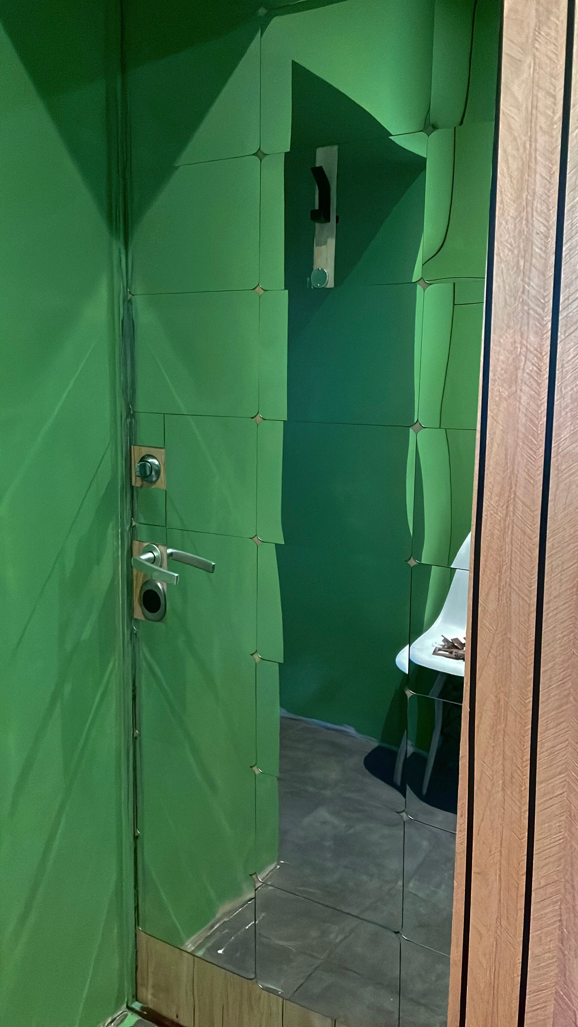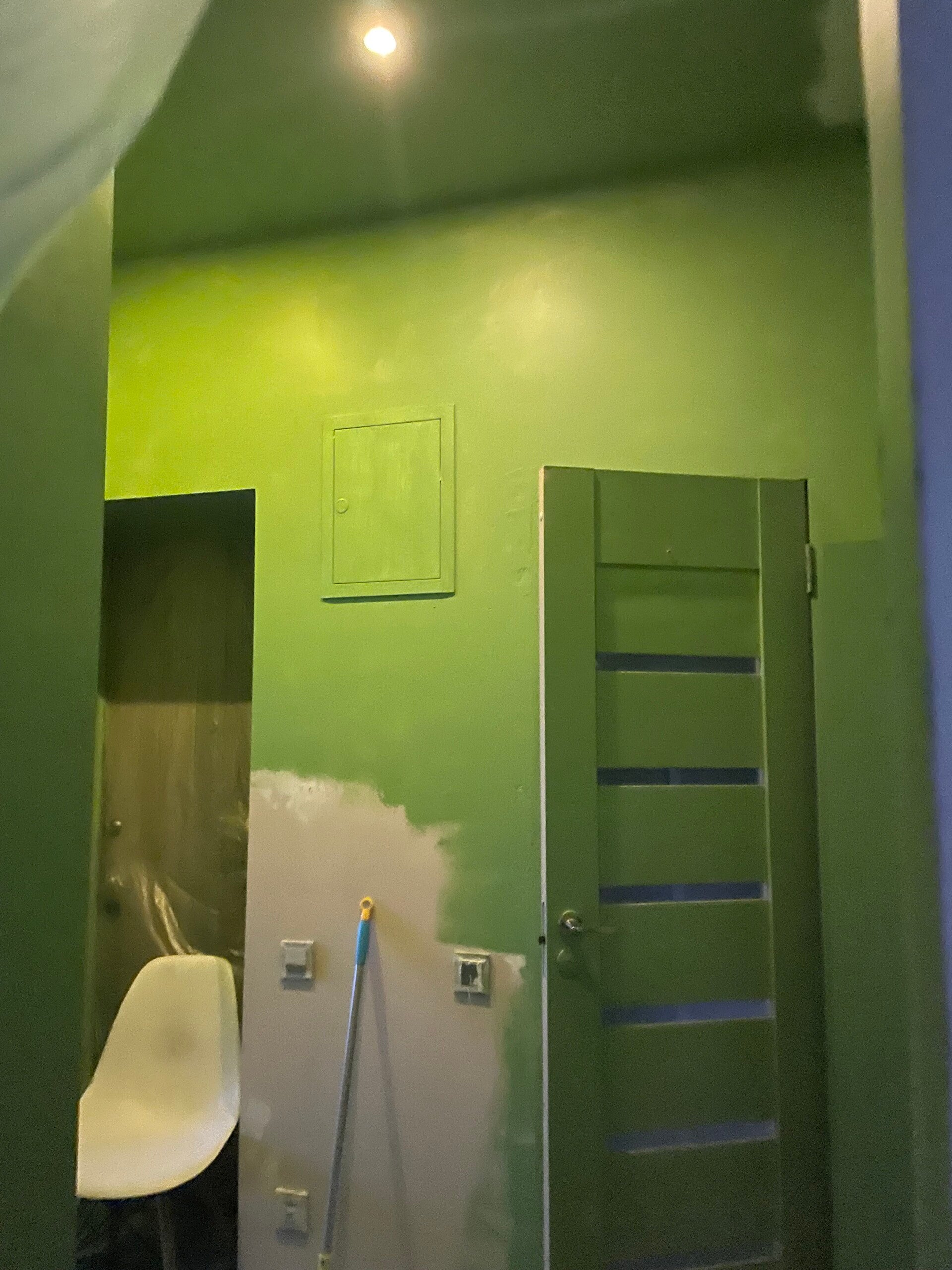 Solutions: to create a jungle-themed hallway; it has a lot of functionality, but everything is hidden and disguised. Paint the hallway one color—walls and ceiling—this visually removes the feeling of confinement; make the front door mirrored on the inside; paint the bathroom doors and furniture the same color as the walls; make the freezer a darker, accent color, using glossy paint, thus turning it into an art object. Also, apply decorative solutions—artistic Wall painting and 3D wallpaper in the form of slats. The flooring will be artificial grass. The electrical outlets will be painted copper.